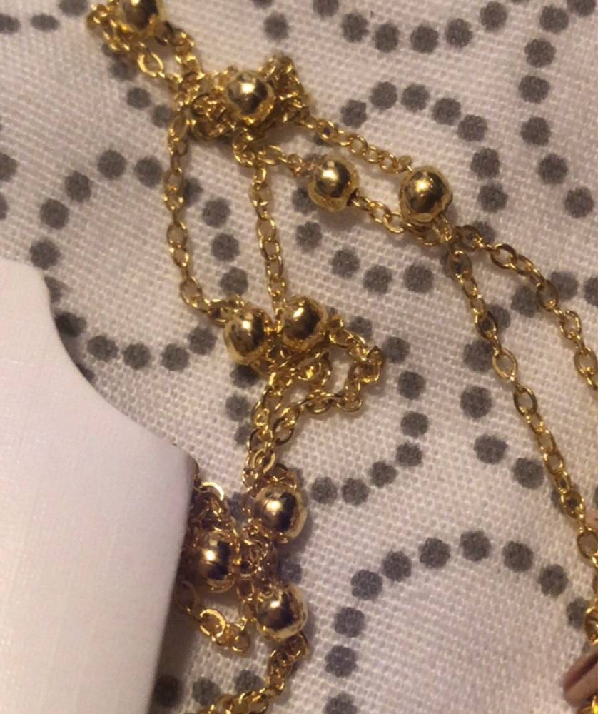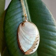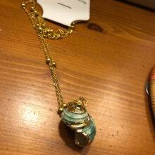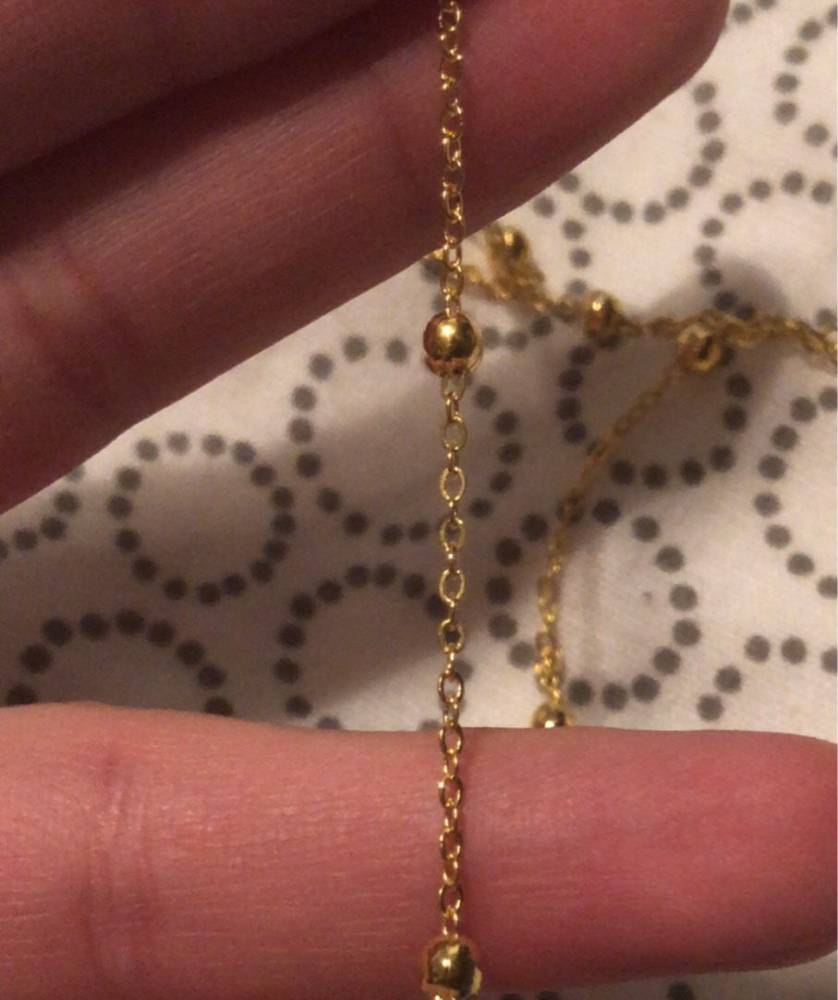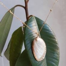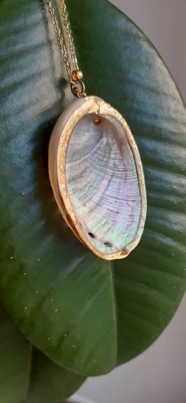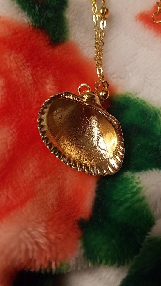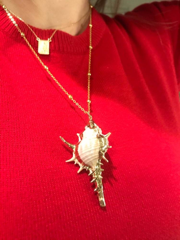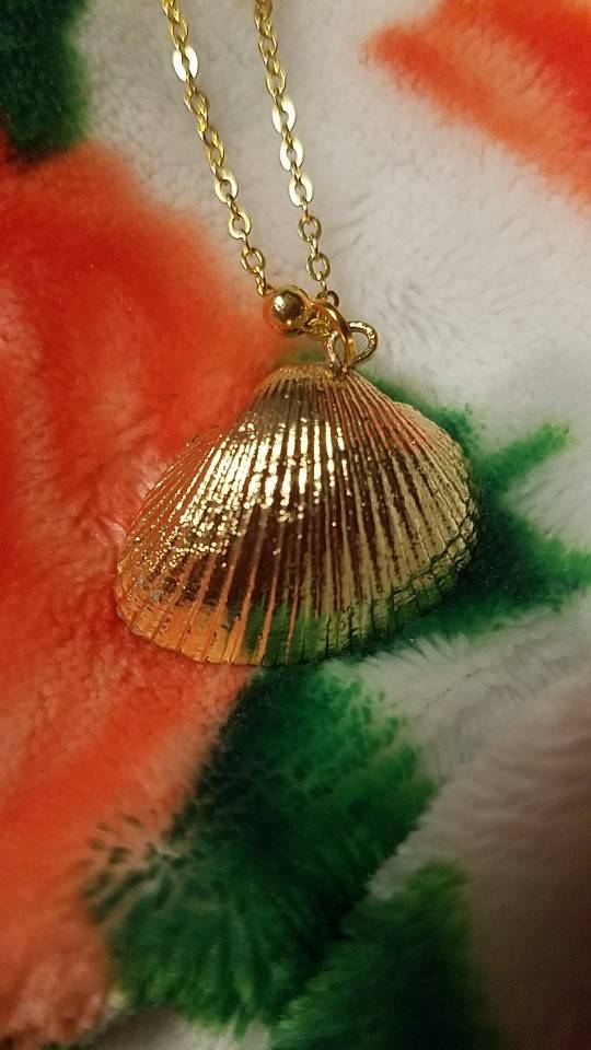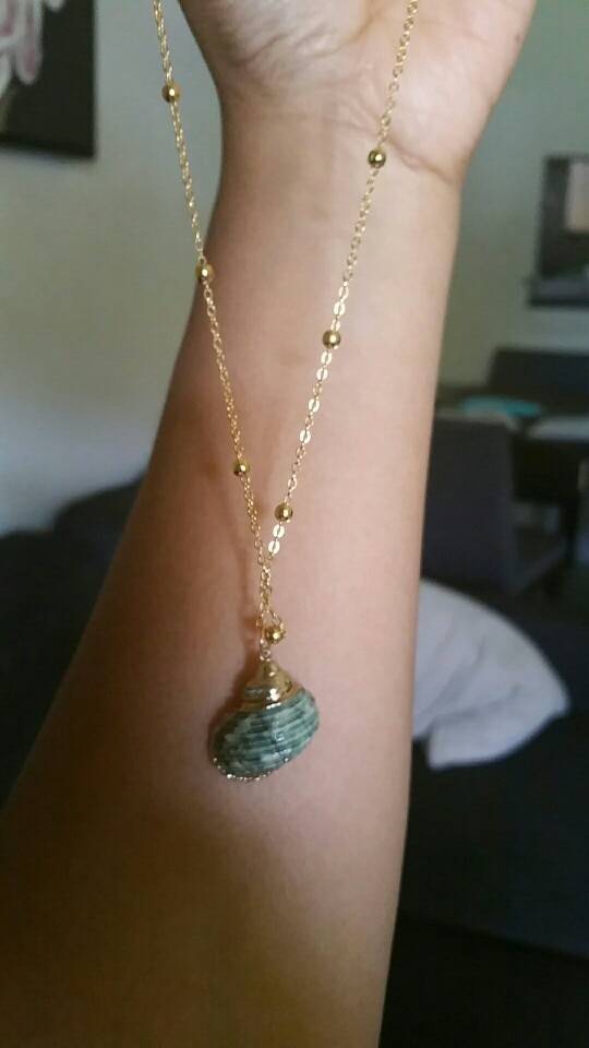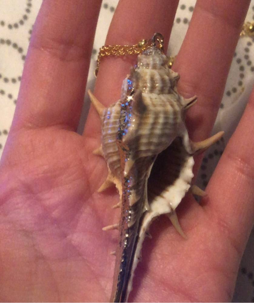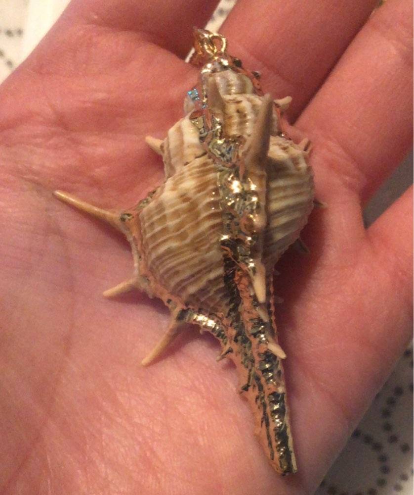 So beautiful! Ordered on: 11-11-2019 Received on:12-01-2019 Packaging: The package came in a secure bag that kept it perfectly intact, it was also wrapped in an additional plastic wrapper! Product: The material is different in the chain part and the actual shell. The chain is made up of a metal material and the small beads spread out are a plastic like material painted in gold, it is not possible to tell unless you feel it with your hands. The shell pendant appears to be an actual shell covered in a material to make it shiny and protect it, it is also painted with stripes of gold that seem to be sealed in. There is no flaking or scratching I’m very impressed, the spikes on the shell are a bit pointy so be careful to not press into your chest when wearing! Overall: I would definitely recommend the item you get exactly what is pictured, as long as you treat it with care it will last a while. Thank you store!! :)
