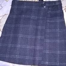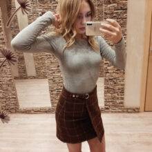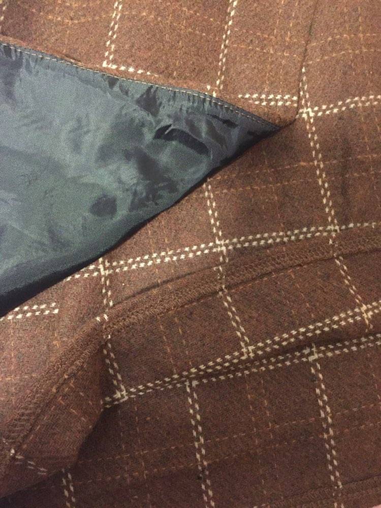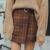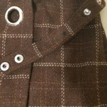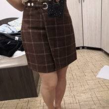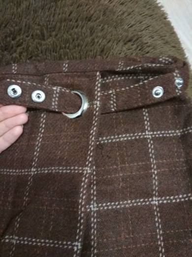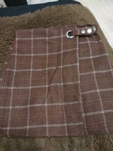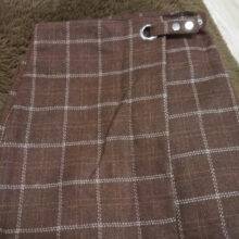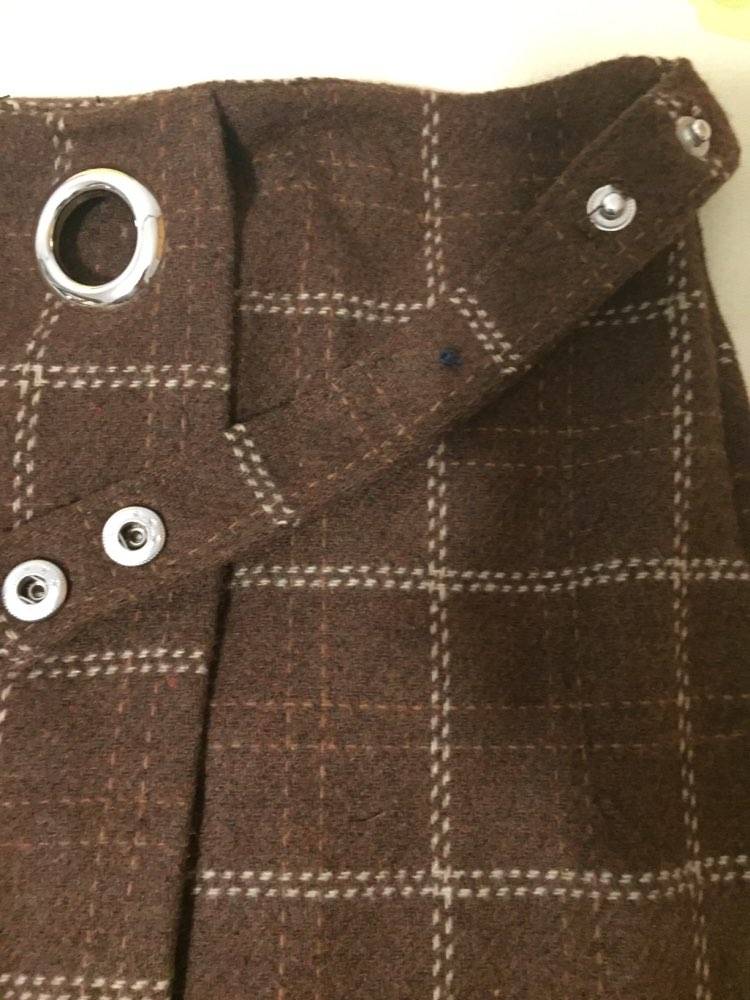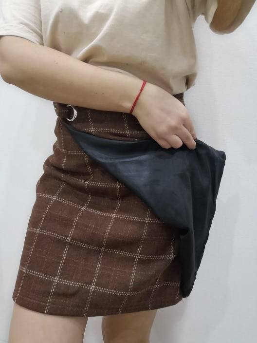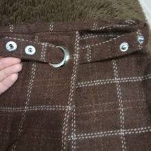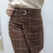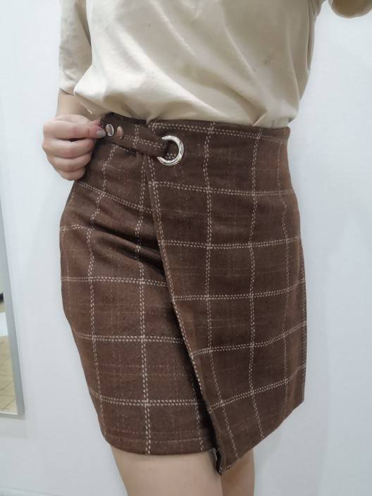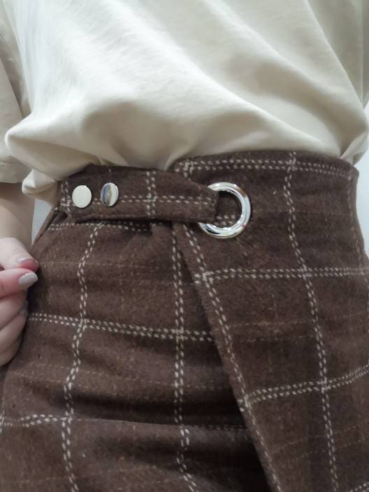 Exude warmth and elegance on chilly winter days in this wool plaid mini skirt. This charming wraparound skirt flaunts classic good looks that make it the picture of wintery sophistication, but leaves enough room for you to play around with your favorite styles and fashion preferences. It has a smart A-line silhouette and closes with a chic circular belt buckle detail at the waist. Two vintage buttons on the belt perfectly complement the stylish plaid print that adorns this brown mini skirt.